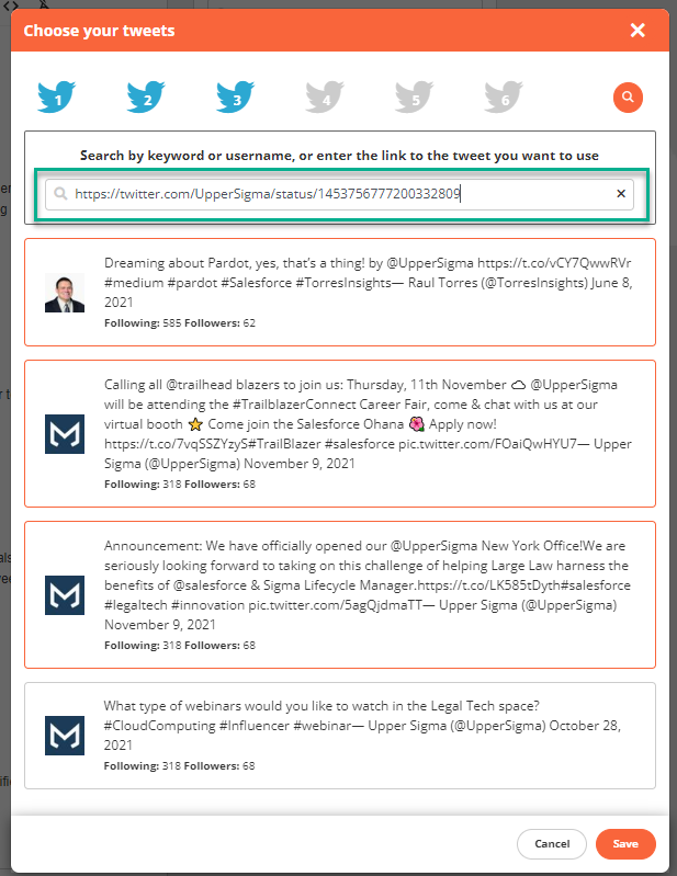 The twitter picker will try and suggest content but if you want something specific, simply copy and paste the URL to the tweet you would like to see along side your blog post.